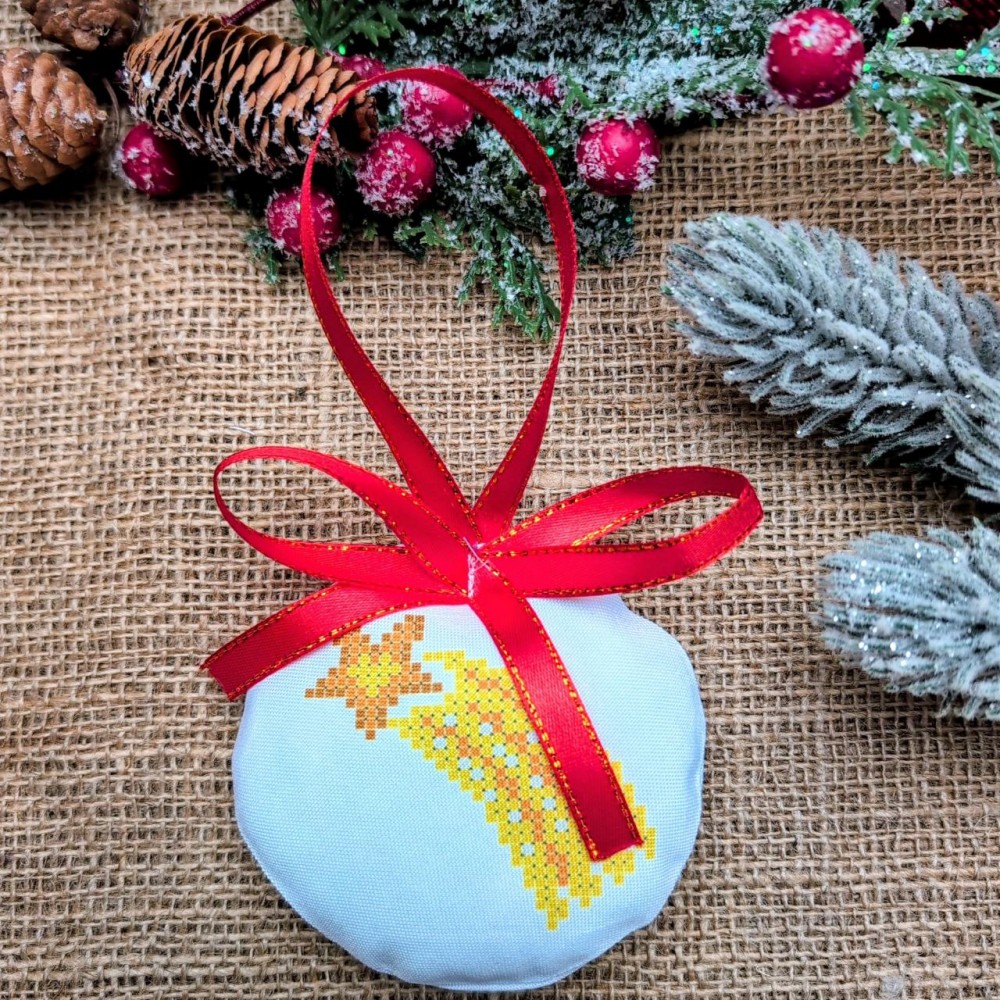 Пошита новорічна іграшка (прикраса) для вишивання нитками, бісером з нанесеною схемою на тканині. В комплект входить інструкція в якій вказано кольори бісеру і його кількість та рекомендовані номери ниток DMC. Іграшка пошита, та не потребує додаткових операцій по шиттю.