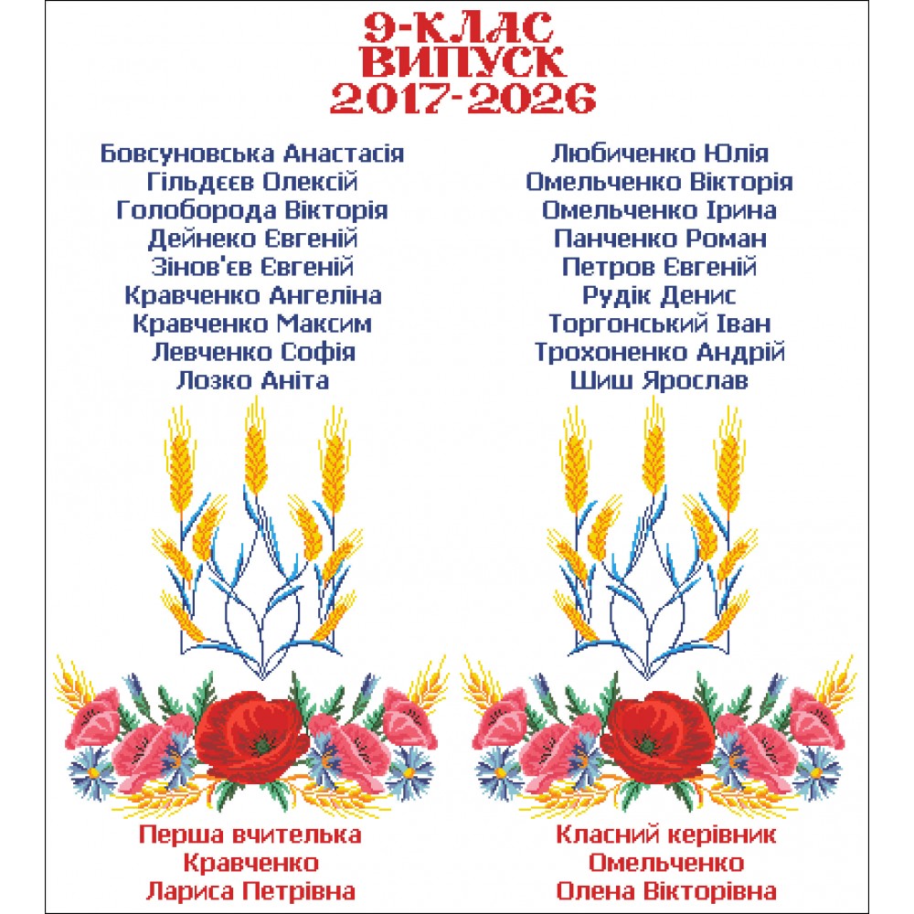 Індивідуальна розробка схеми та виготовлення заготовки рушника з іменами учнів та вчителів під вишивку бісером, нитками, рубкою.